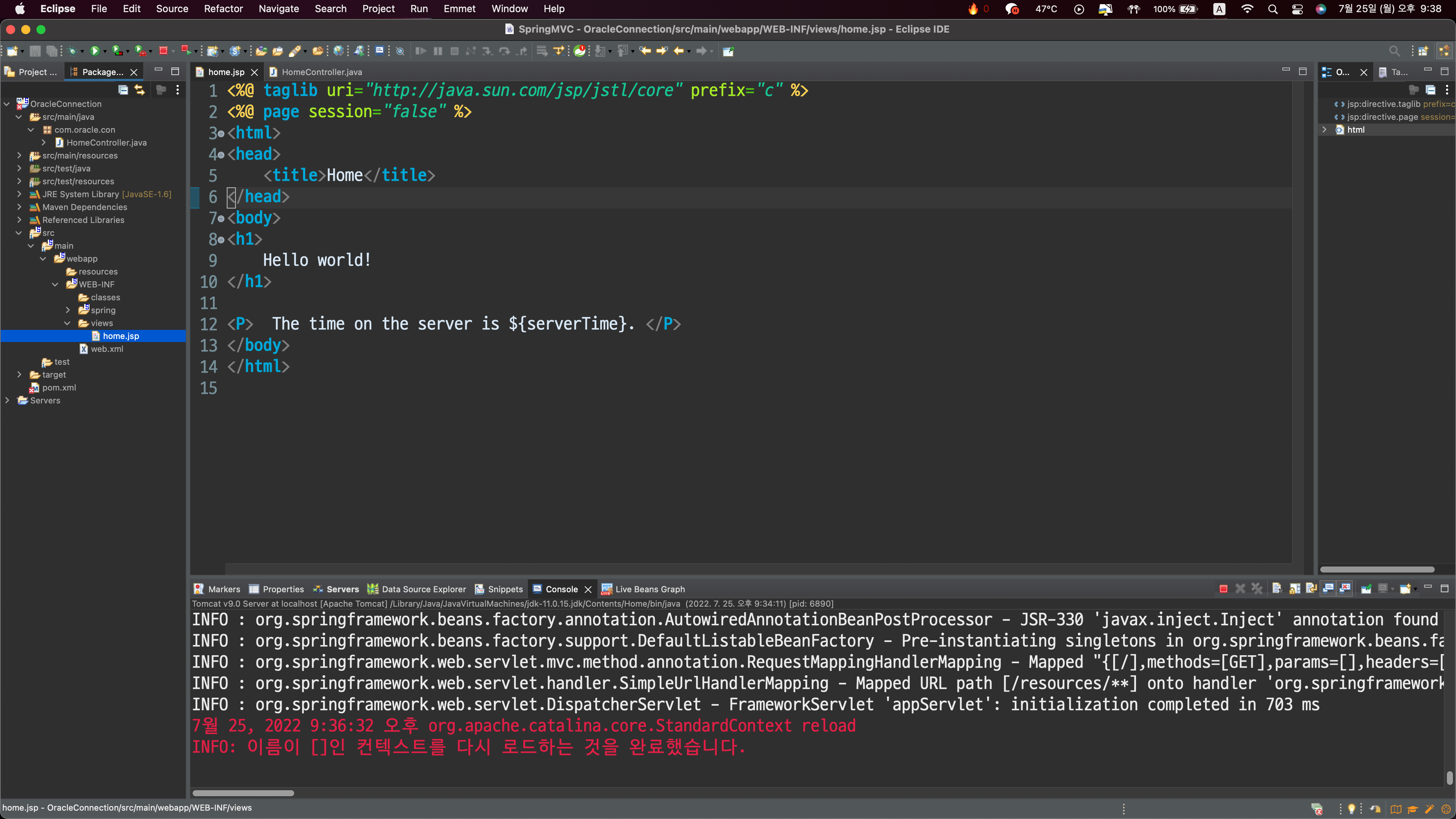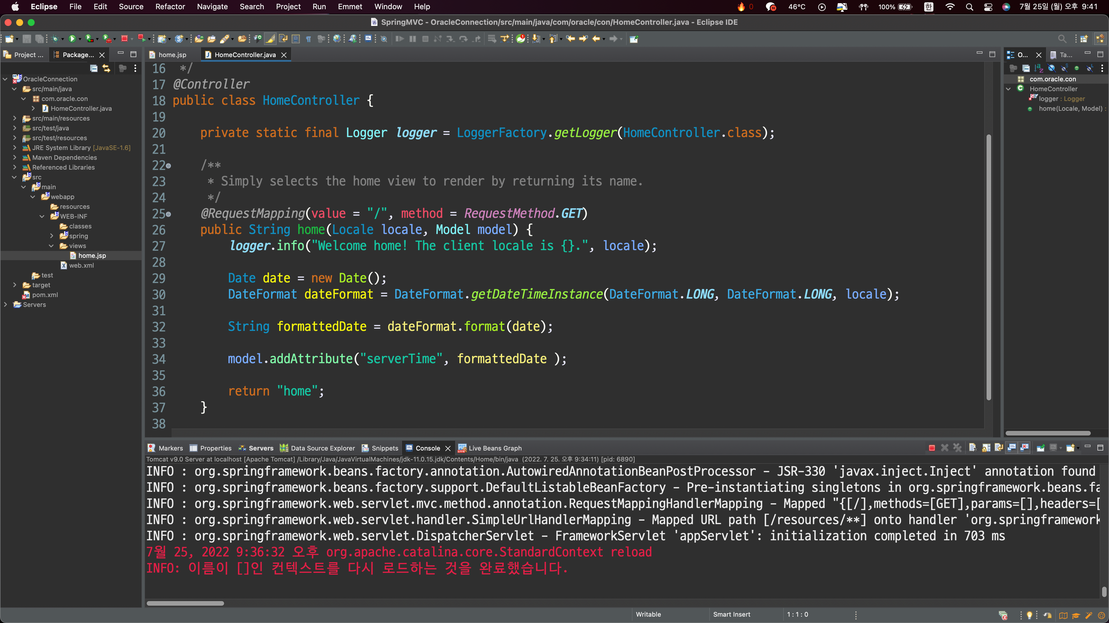 SpringMVC를 처음 생성하면 이런 모습으로 생성될거에요. view에 home.jsp와 HomeController.java가 있을거에요.