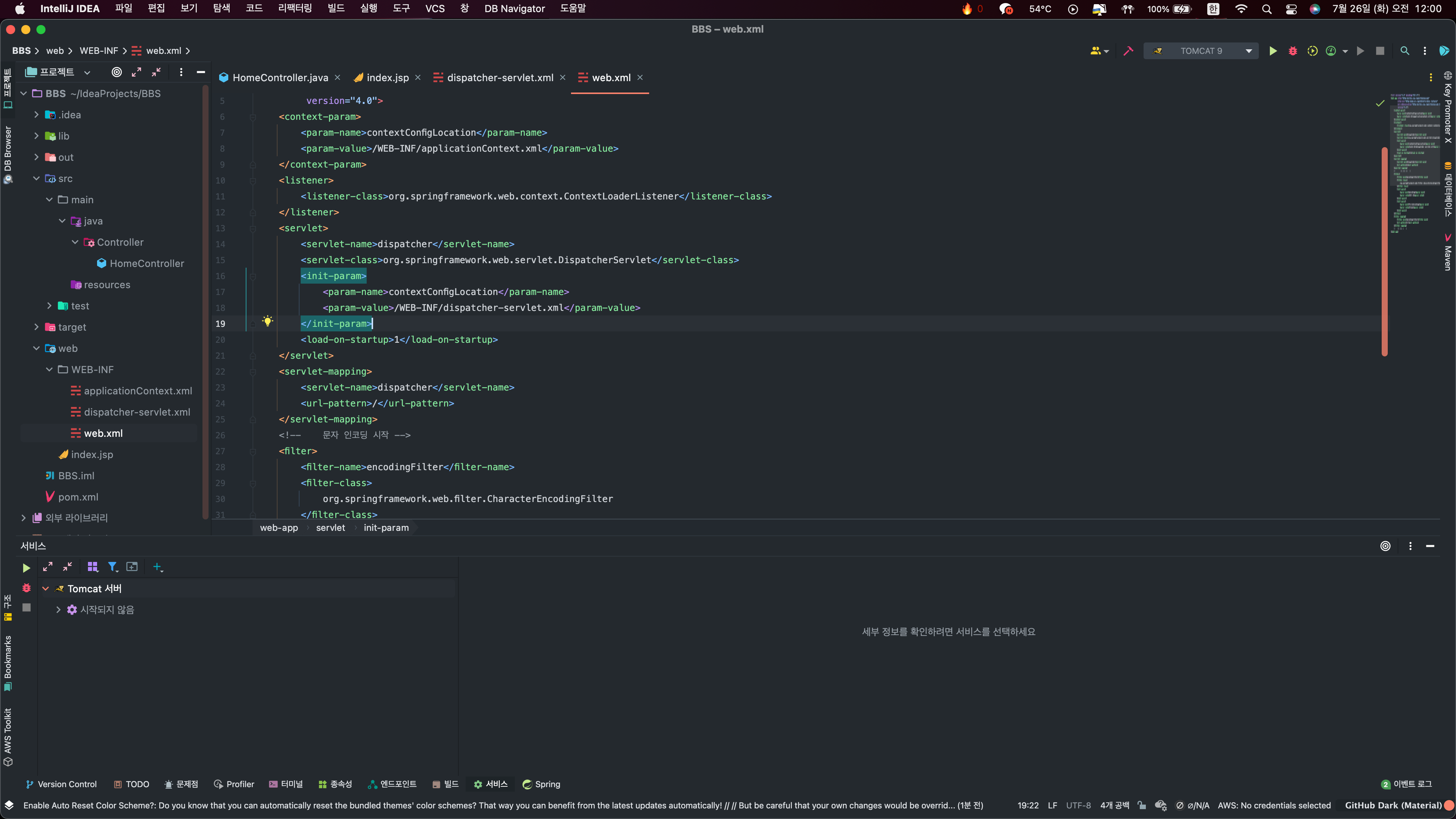 여기서는 dispatcher-servlet.xml을 참조하고 있네요~ 그렇다는 건 인텔리제이에서 코딩할 때는 dispatcher-servlet.xml에 bean을 생성하면 되겠군요!