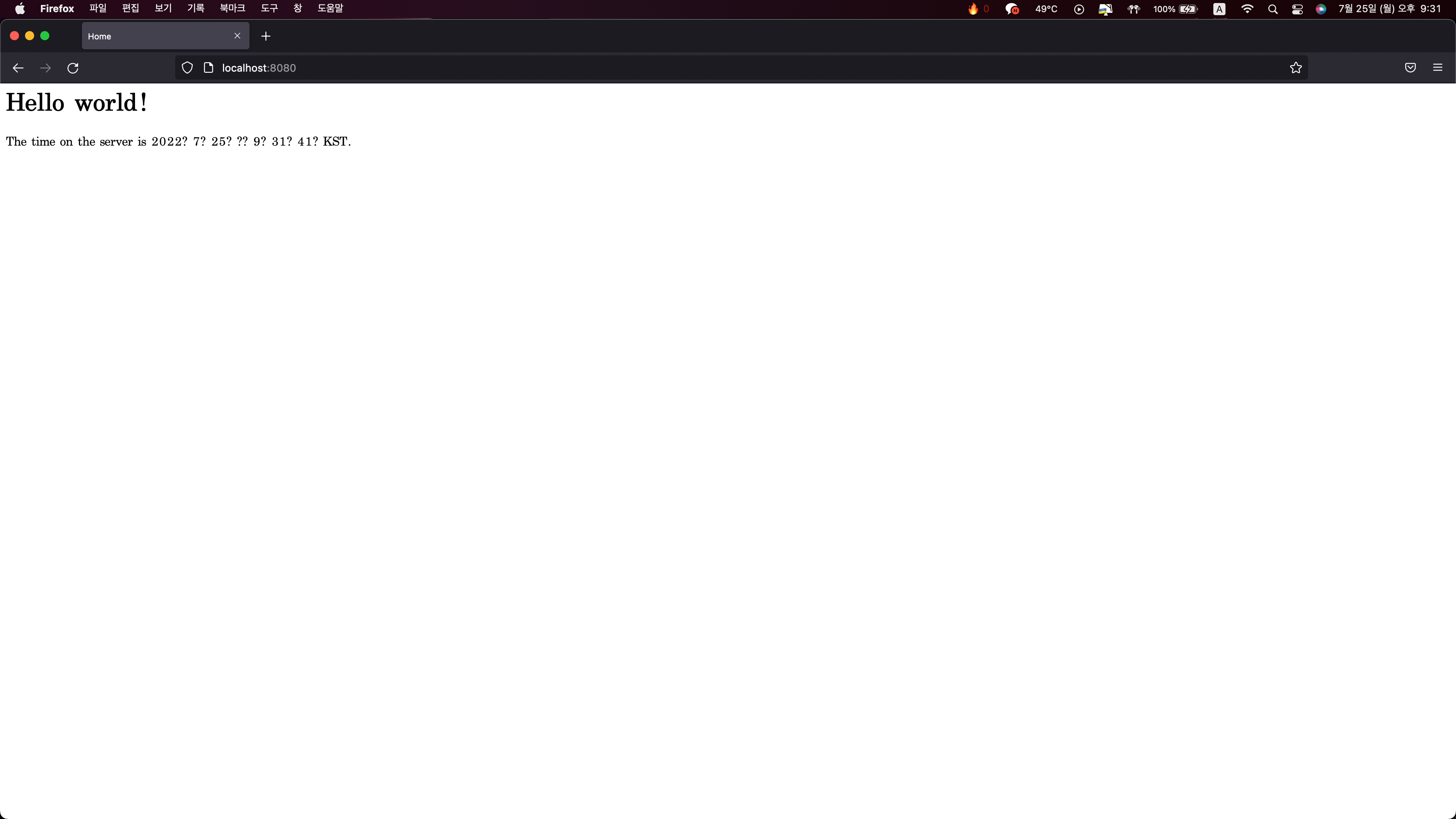 우왕 h1태그로 Hello world!랑 아까 model로 넘겨준 serverTime 잘 뜨고있...는데 한글이 깨졌네요..? 이건 web.xml에 utf-8파일 설정을 안해줘서그래요.. 아래에 다음과 같은 코드를 추가해봅시다!