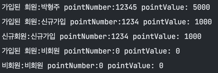 System.out.printf("가입된 회원:%s" + " pointNumber:%d" + " pointValue: %d\n", userName, pointNum, pointValue);